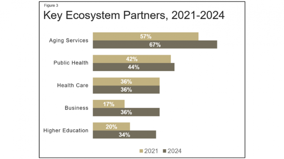 Preliminary data from the 2024 Annual AARP NAFSC Members Survey highlight the critical role of partnerships across the age-friendly ecosystem. When asked, “Which of the following are key partners in your age-friendly work?” respondents identified several sectors that reflect the broad reach and inclusivity of their initiatives. Aging services led as a key partner, with 67% of respondents citing them as collaborators in 2024, up from 57% in 2021. Public health organizations were also prominently involved, with engagement rising from 42% in 2021 to 44% in 2024. Healthcare maintained consistent partnership levels, while business and higher education sectors experienced notable growth in their involvement.