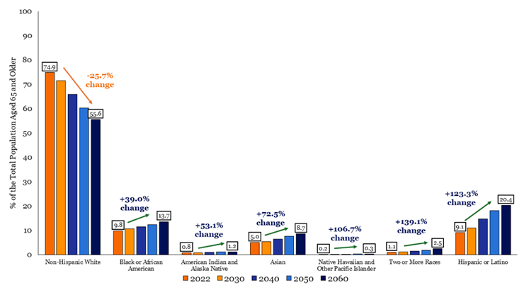 In the United States, population aging has coincided with growing racial and ethnic diversity. Recent population projections from the U.S. Census Bureau, illustrated in Figure 1, below, indicate that racial and ethnic minority groups ages 65 and older are expected to experience the highest rates of population growth.